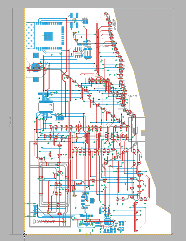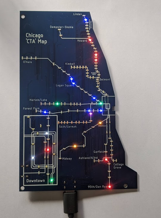 Once I had the code working, I designed a PCB. The layout is meant to represent the train map as closely as possible, even attempting to recreate the profile of Michigan Lake.