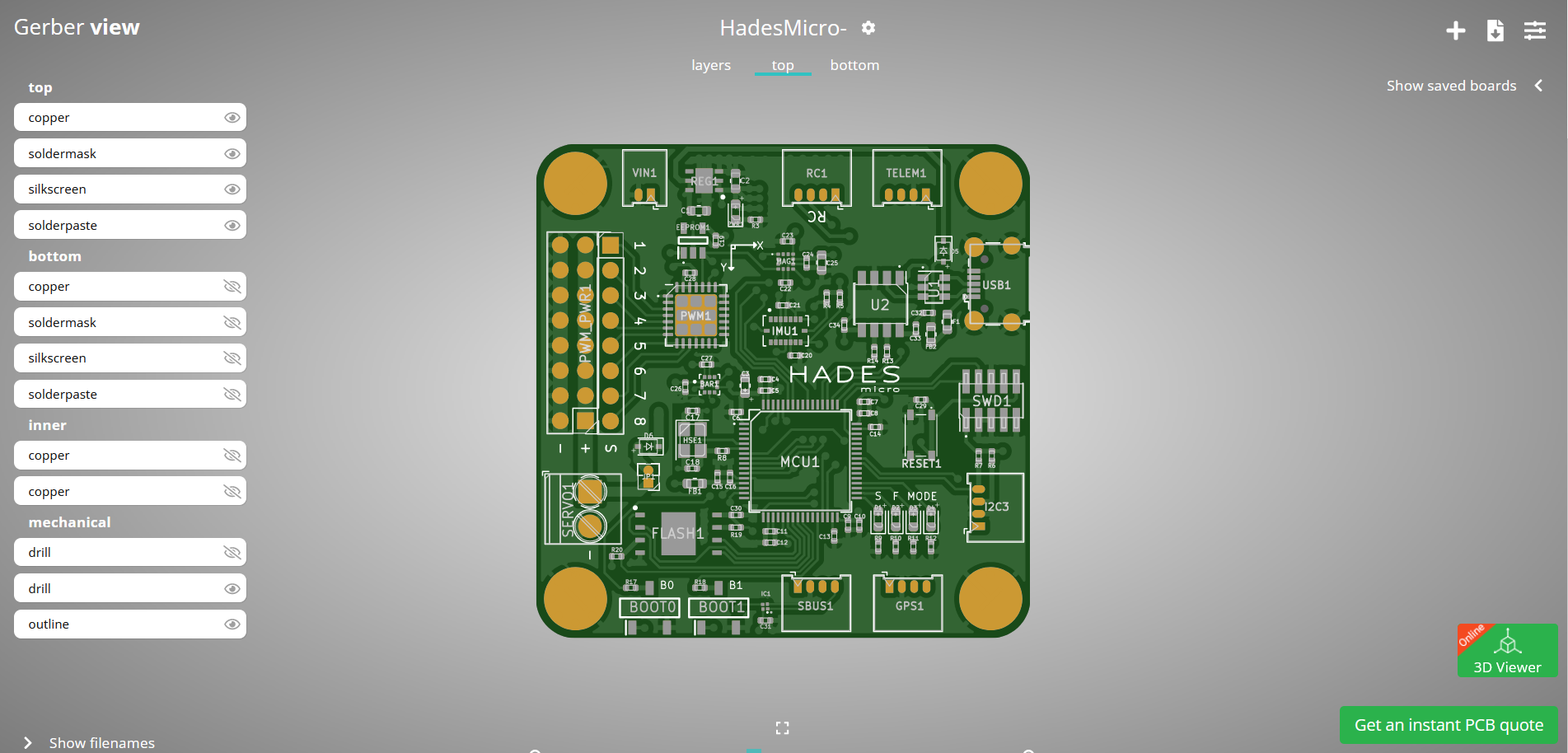 The files provided for this challenge are Gerber files, which are used for the production of PCBs. Loading these files into a Gerber viewer reveals the following.
