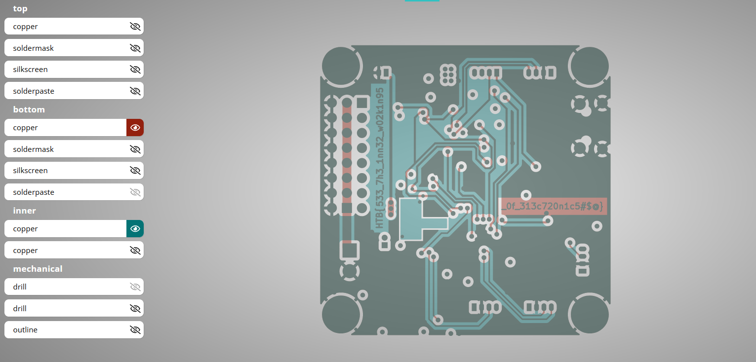 And if we turn off all layers other than the copper layers which are used for the ground planes and signals, it reveals the flag. This is hinted in the challenge description that the boards are not working, therefore there might be an issue with how the board was laid out.
