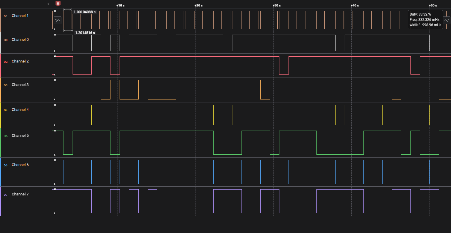 To decode this easily, we can identify the moment when channel one goes from low to high and take in the values of the other channels and reference back to what would appear on the 7 segment display. Processing it in Python reveals the flag.