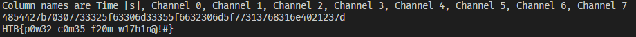Looking closely at the signal, we can see that one pulse suggests a frequency of 115.207kHz. This is close enough to the standard baud rate of Async Serial devices, the other common one being 9600 baud. This a common theme for HTB. Updating the analyser reveals ASCII characters.