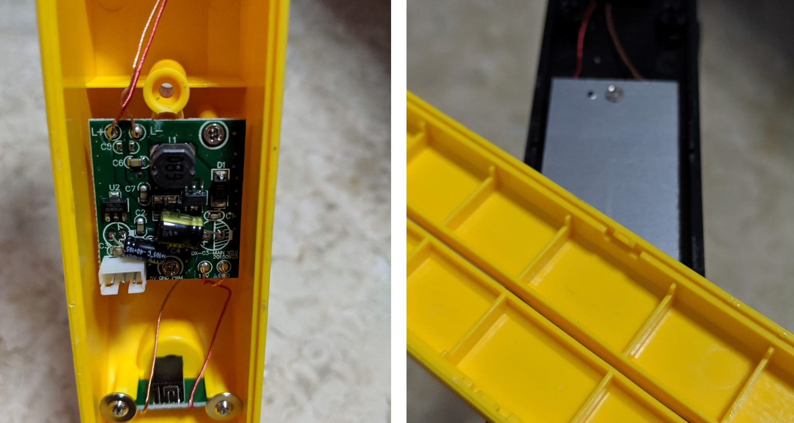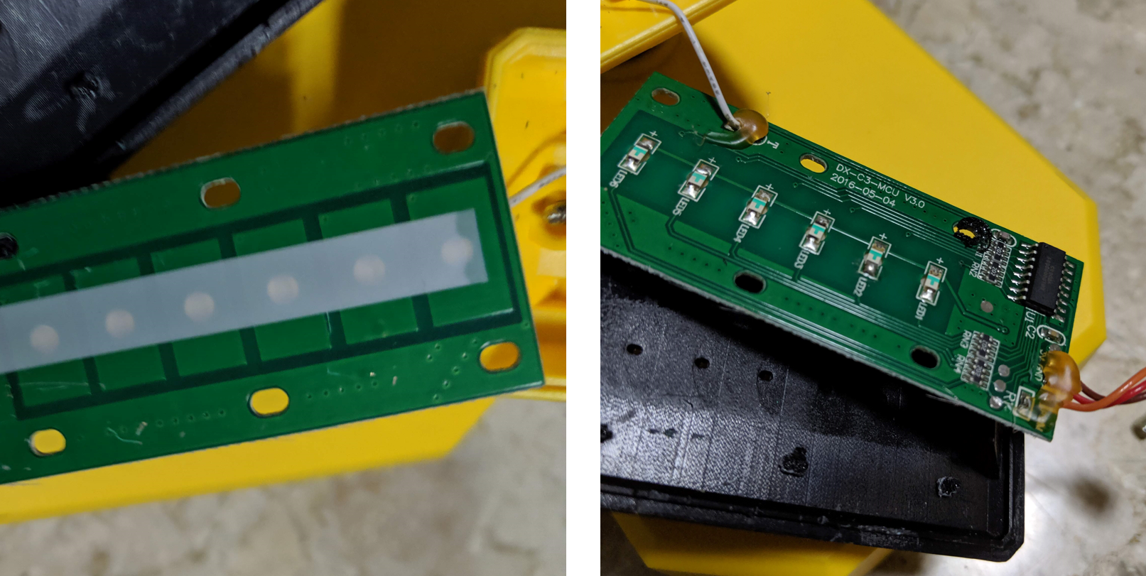 This is the touch panel on the front of the lamp. Nothing too special except that the LEDs are covered with a piece of tape and there are holes drilled into the PCB for the LEDs to be reverse mounted so that they are flush with the PCB. Also note the mounting holes appear to be ABS that have been melted down to hold down the PCB. Note the black stuff on the PCB on the right picture. I suspect these might have been little locators for the PCB, which were then melted to hold the PCB flush to the surface. I had to break these to take out the PCB. Also note the colors of the wire attached to the PCB. Red: power, Brown: ground, Orange: signal (PWM)