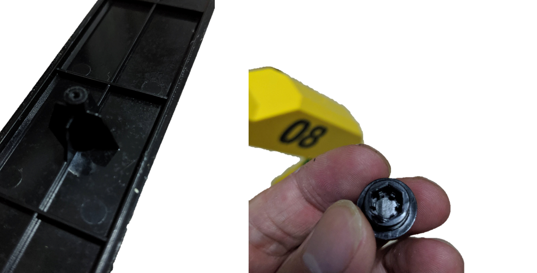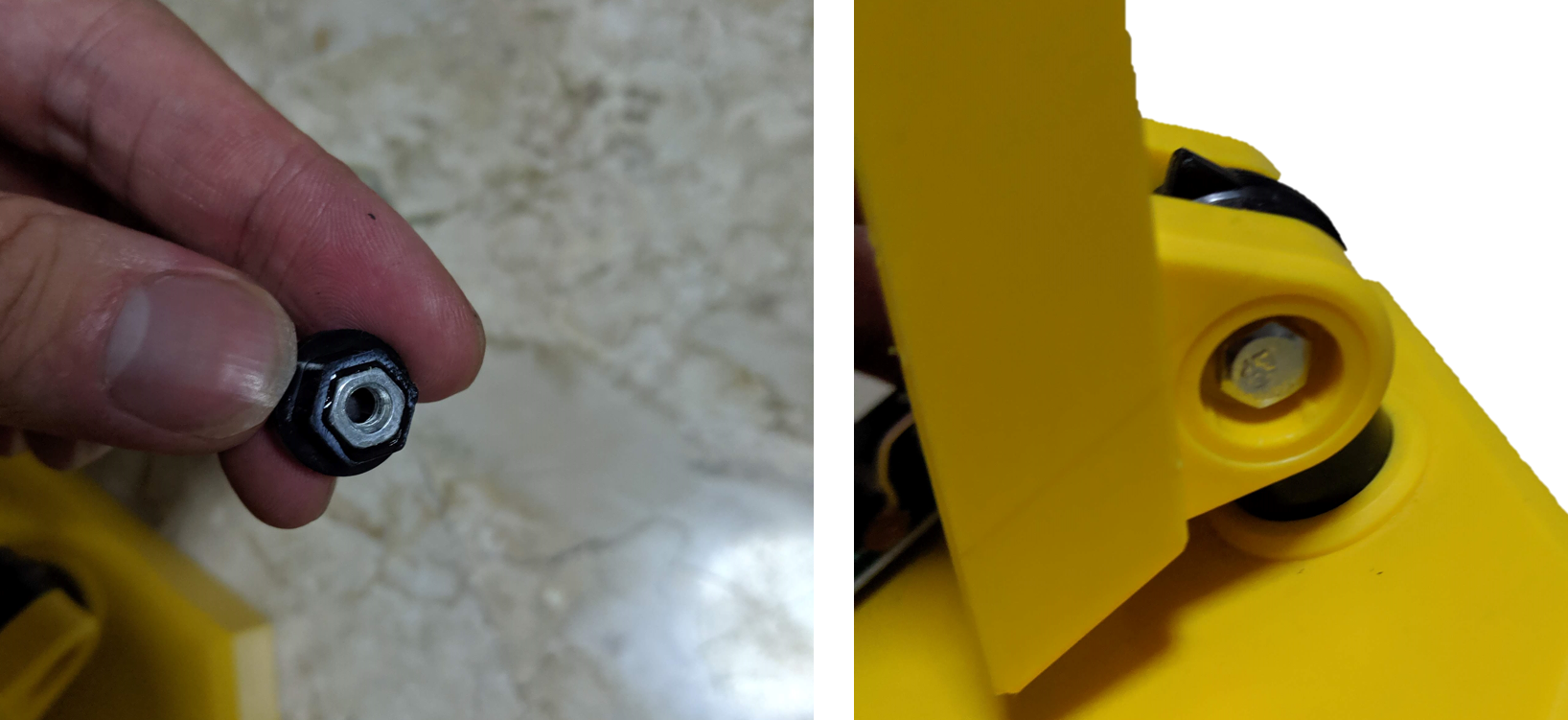 In these last set of two photos is the head of the cap that drives the bolt. By turning this bolt, it pulls the nut in and clamps the joint stiffly, allowing it to stay in position. On the left is another design of a standoff for a screw and it is reinforced with flanges in two axes. In my 3D printed designs, I have found standoffs to be rather brittle, so I think this is a very useful design pattern.
