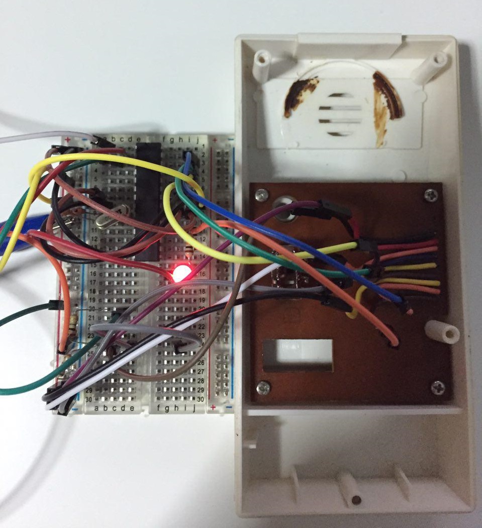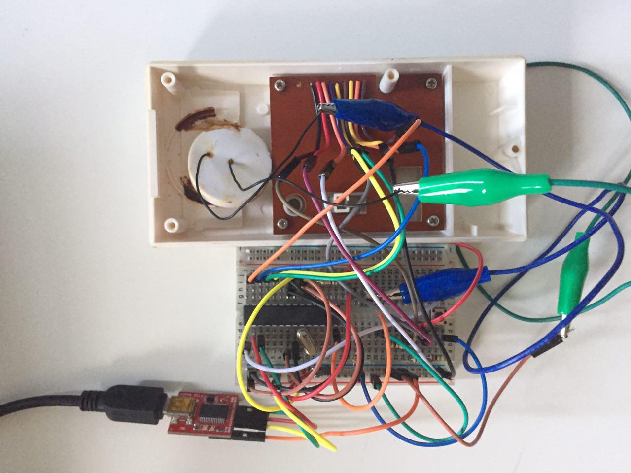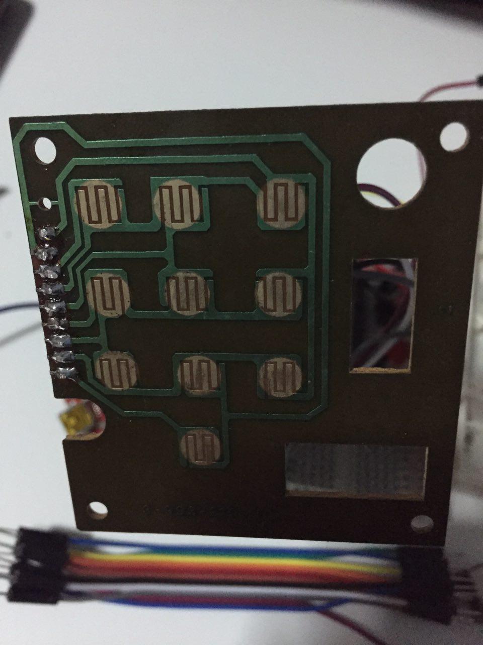 That’s an ATMEGA328P aka the chip of Arduino UNO fame. I then used it with a voltage divider to supply 1.3V, 2.6V, and 0V to the circuit for detection. When not pressed, the pins are drawn up to 5V.