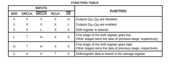 Now we have up arrows in the columns SRCLK and RCLK. This means that upon change from low to high, the function will be enabled. We will usually send regular pulses to CLK pins, so they trigger periodically. In our case we want the shift register data to be stored and our shift register to respond, so we will send clock pulses to these pins.