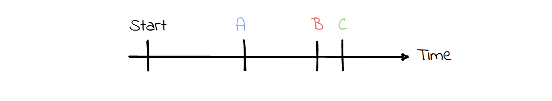 In terms of the an observer timing when each node would detect the sound, the information returned would be in the diagram below. At the start of listening, node A will hear it first, followed by node B and then node C.