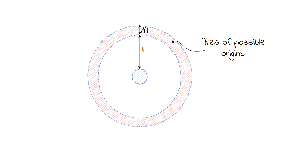Now to picture the problem, since audio signals radiate out from a single point, and you don’t know the direction, the only info is the time which each node detects the sound.