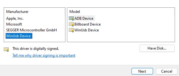 Under WinUSB device select ADB device