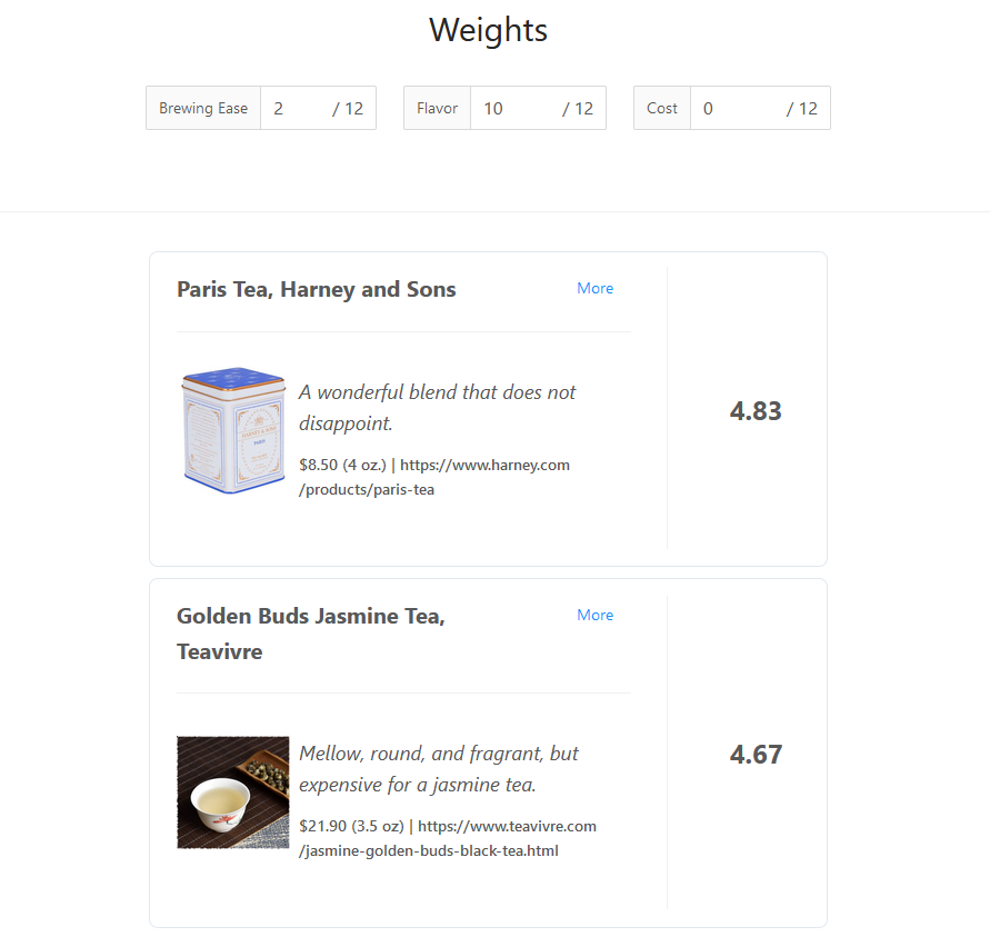 React-teave is an experiment, and an exercise. It upgrades the previous version of the site with React so that the page is now more interactive. You can now specify the importance of each criteria of the tea to you: how expensive it is, how difficult it is to brew, and how much it costs. The website will sort the reviews accordingly. For example, if you don’t care about the cost nor the brewing ease, then the website recommends Paris Tea from Harney and Sons, and following very closely behind is the Golden Buds Jasmine Tea from Teavivre.