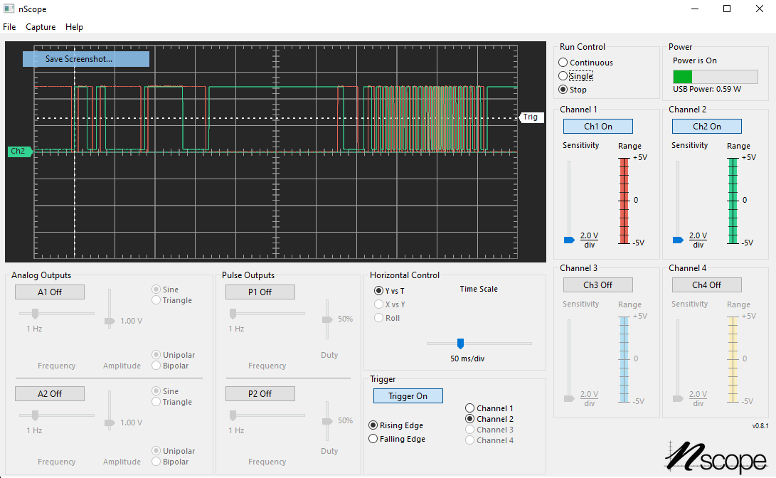I plugged it into the nScope to read the signals, and after some experimentation (read: randomly plugging in wires) I was able to get something resembling a quadrature encoder readout. Success! Well partial success. While Ch1 responded, Ch2 (the flatish green line) remained stubbornly at a constant level.