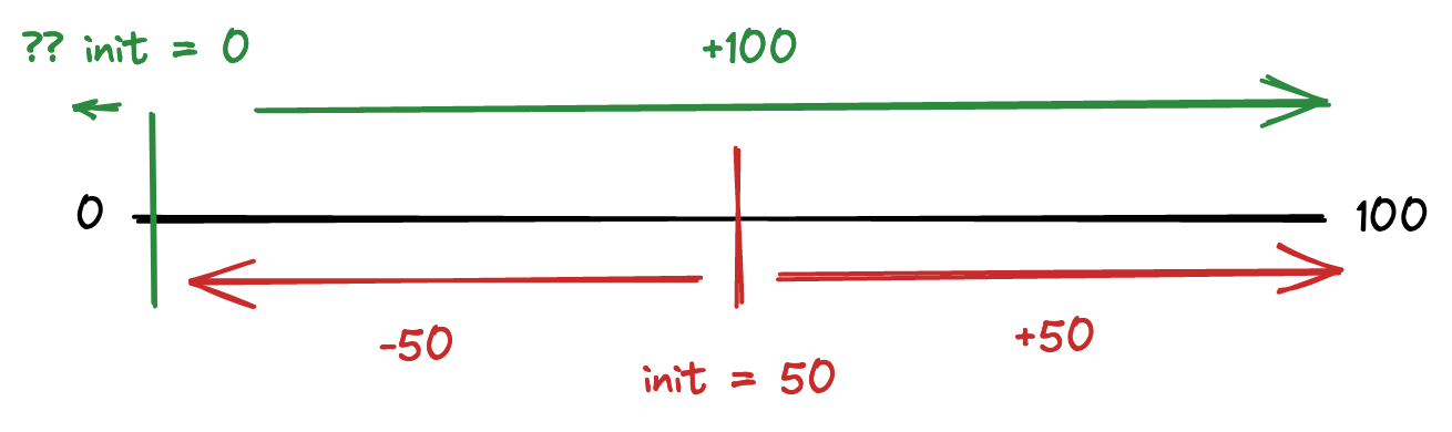 If we start at zero and don’t implement two’s compliment, the value will roll around from 0 back to 100, which is undesirable. Instead, I started the value in the middle of the range, and this allows it to decrement and increment normally. All I have to do is to keep track of the initial value and reset it before it rolls over.